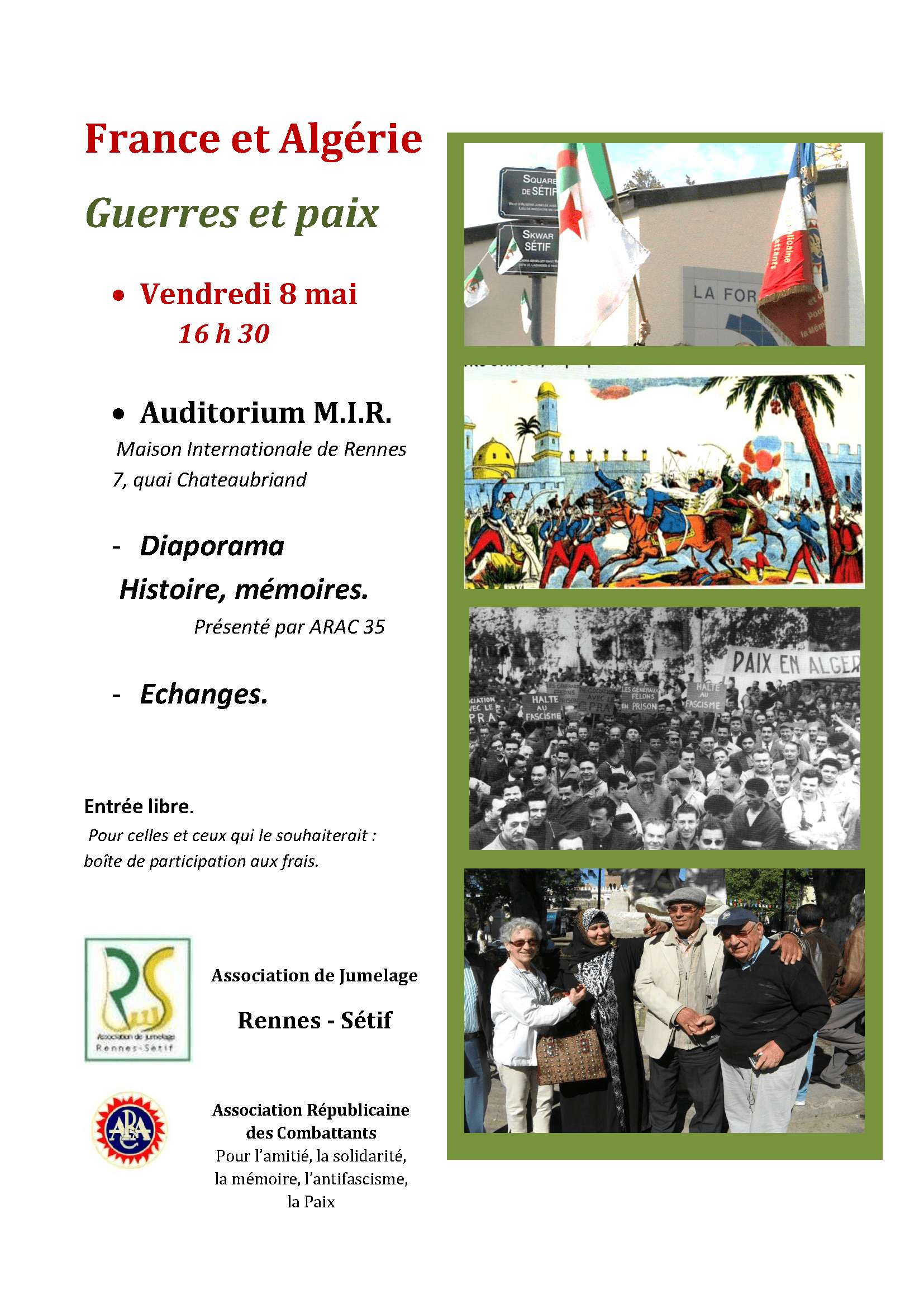 Conférence – France et Algérie « Guerres et paix », par l’Association de jumelage Rennes-Sétif et l’ARAC